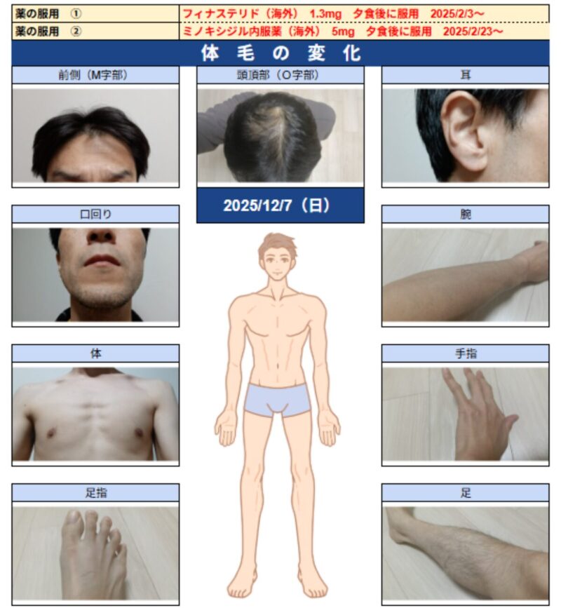 - 口回り:服用前に比べて全体的に髭の太さが増し、濃くなってきている(変化あり)