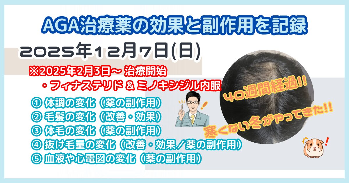 ・動悸や息切れを感じることがない1週間であった。現状のAGA治療薬は特に副作用はないと思われる。