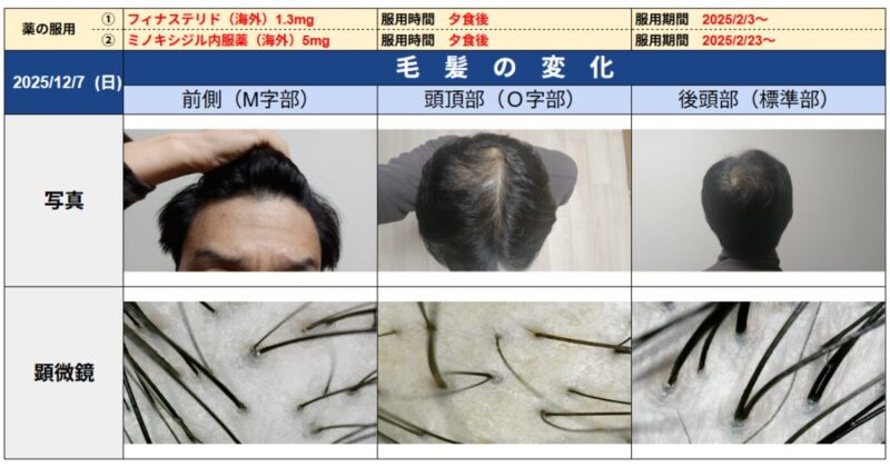 - 頭頂部 O字部分「顕微鏡」:服用前に比べて1本1本が太くなってきている。(変化あり)