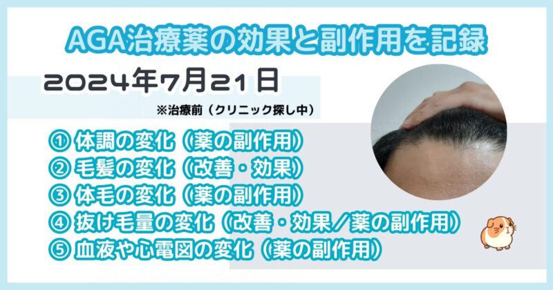 薄毛の40代パパ、AGA治療薬でどこまで改善するのか。AGA治療薬の副作用について記録にしていきます。 はーい6ヶ月目だよ。半年過ぎようとしているよ~始めるのかい? 始めたい・・・ 管理する記録 体調の変化(薬の副作用) 毛髪の変化(改善・効果) 体毛... -