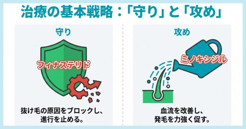 • AGA治療薬は「守り(抜け毛予防)」と「攻め(発毛)」の組み合わせ