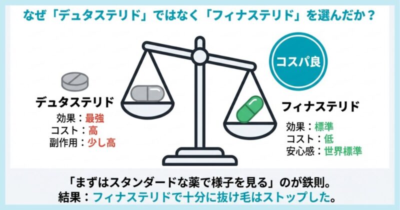 理由は、費用と副作用のバランスです。 デュタステリドの方が効果が高い分、費用も少し高く、副作用のリスクも(確率としては低いものの)わずかに上がると聞いたからです。