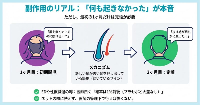AGA治療薬を始める前、一番のハードルだったのが「副作用の恐怖」でした。