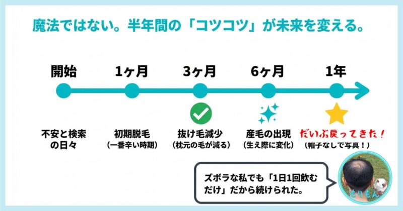運営者の毛髪や体調の変化を詳しく知りたい方は以下の関連記事をご覧ください。
